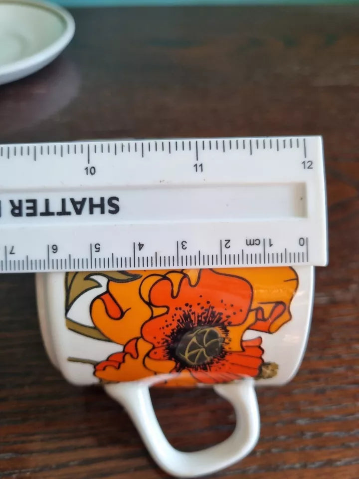 Please note these have some defects from manufacture 1 saucer has a slippage of the paint ring, 1 cup has a small area where the print hasn't taken properly because the cup is not smooth underneath, another of the saucers has a small cream patch in clay that you can see from both sides. I have photographed all these faults.