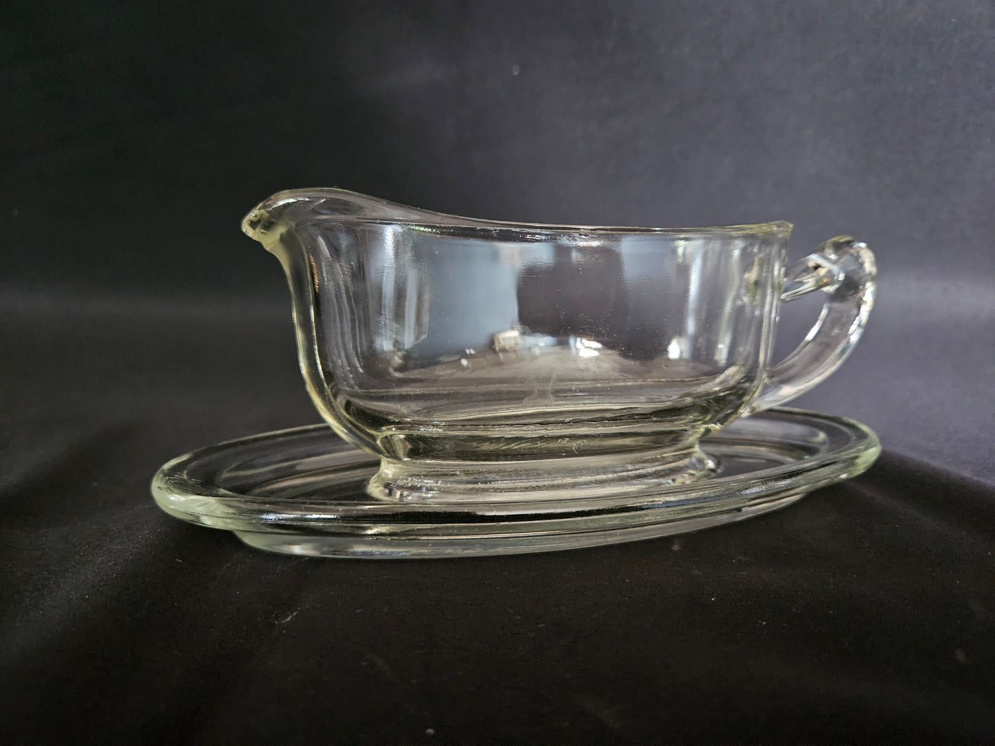 A lovely example of a clear glass gravy boat and saucer by Pyrex. This is the smaller of the two sizes that were made.